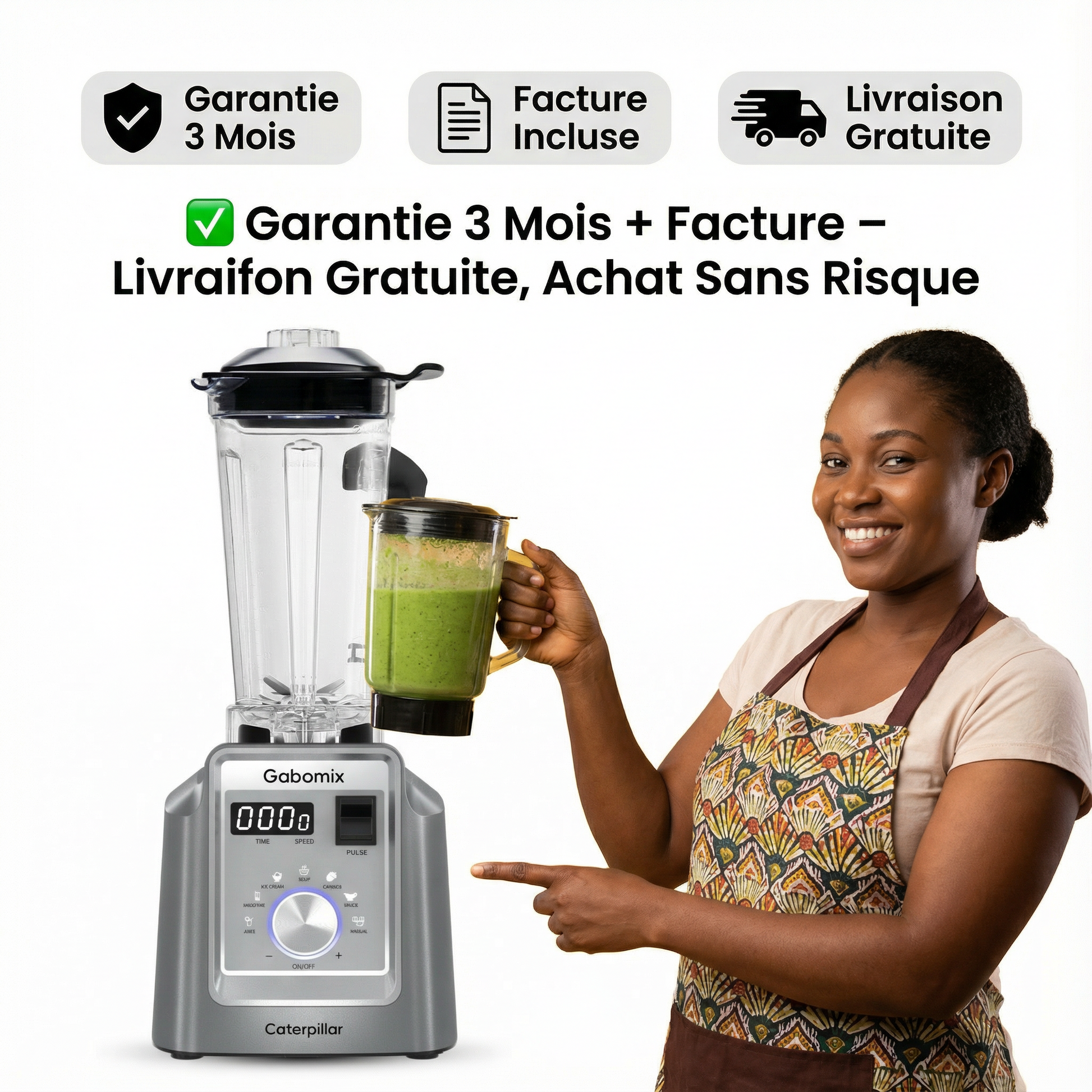 Achetez en toute sérénité. Le Gabomix Caterpillar est livré avec 3 mois de garantie et une facture, preuve de sérieux et de qualité. La livraison est gratuite, et vous pouvez payer à la réception selon votre zone. Zéro stress, zéro risque, satisfaction garantie.